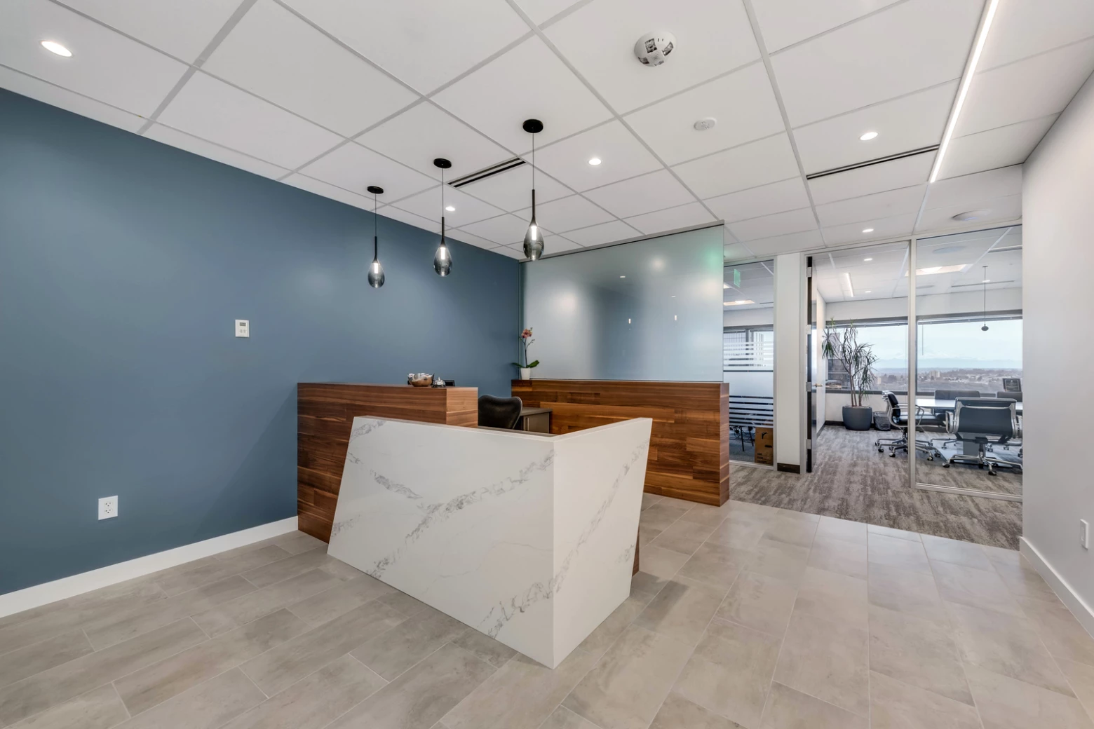 The buildout involved a complete demolition and reconfiguration of the layout and ceilings, resulting in a modern, highly functional office environment designed for efficiency and comfort.